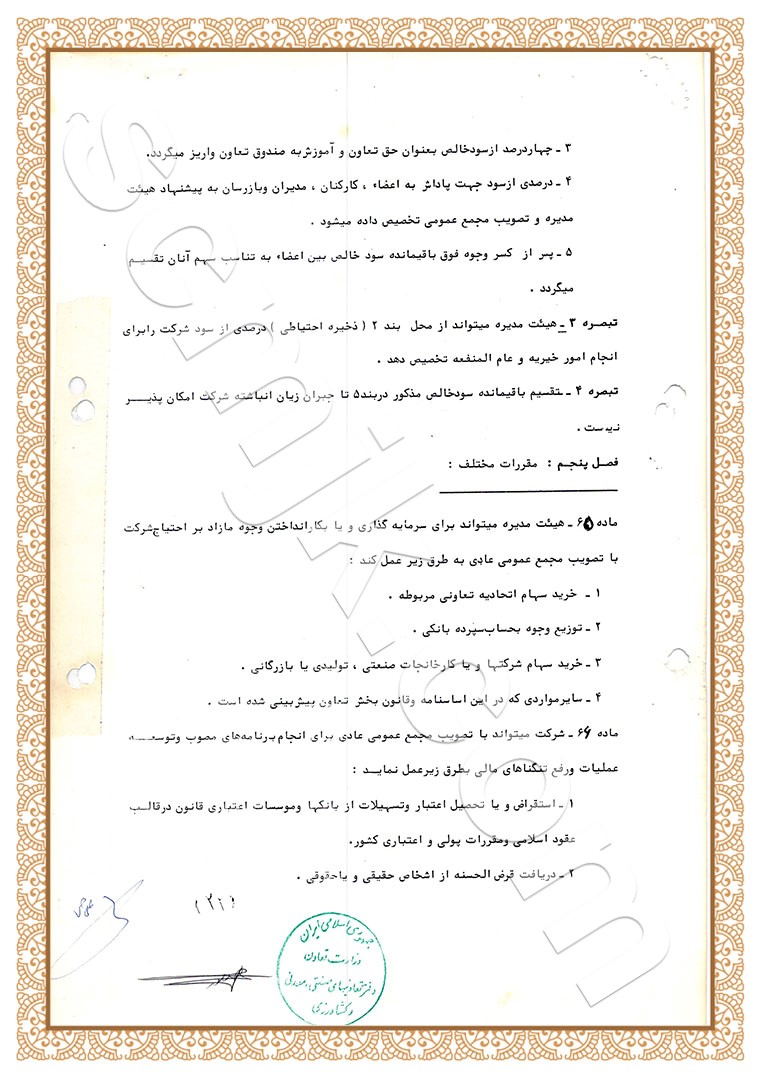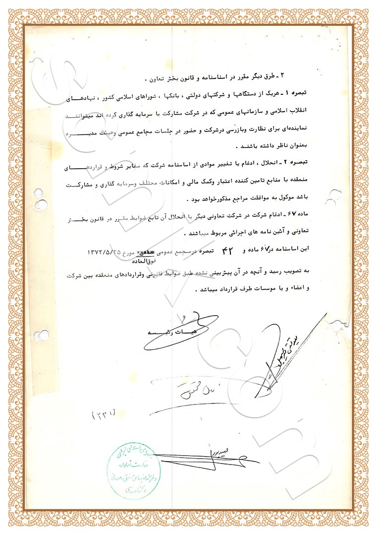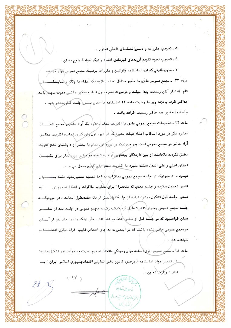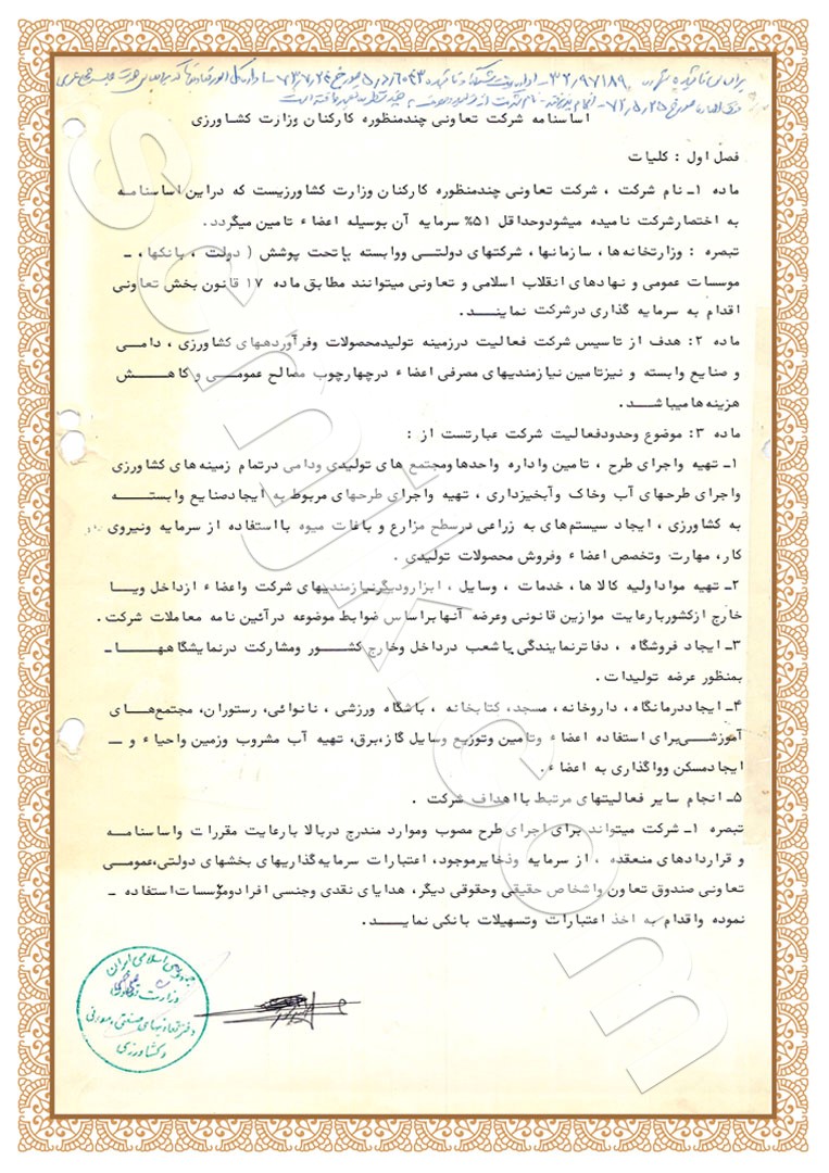 شرکت های تعاونی امروزه یکی از مهم ترین رکن تأثیرگذار در اقتصاد کشور می باشد که به اتکاء سرمایه های تسهیم شده، فعالیت اقتصادی خود را رونق می دهد. زیرا اشخاص بصورت ثابت در آن تصمیم گیرنده و اداره کننده نمی باشند. به نظر برخی حقوقدانان، شرکت های تعاونی را می توان به رژیم دموکراسی تشبیه کرد که از لحاظ اصول، سهامداران صاحب شرکت محسوب می شوند و از طریق مجامع عمومی مدیران و نمایندگان شرکت را تعیین نمایند و بالاترین اختیارات برای پیشبرد اهداف شرکت را داشته باشند. لذا پس از همت هیأت مؤسسین محترم در اولین مجمع عمومی، شرکت تعاونی در مورخ 1367/03/23 به شماره ثبت 69910 با موضوع ایجاد و اداره واحدهای تولیدی، خدماتی، دفترهای مشاوره ای، اجرای سرمایه گذاری، خرید و تأسیس مؤسسات تولیدی، مطالعات اجرائی و خدماتی، تأمین نیازمندیهای مصرفی اعضاء و خانواده های آنها ثبت گردید که به استناد صورتجلسه مجمع عمومی فوق العاده مورخ 1372/02/25 و تأییدیه شماره 6043/د/5 مورخ 1373/07/24 اداره کل تعاون، نام شرکت به شرکت تعاونی چندمنظوره کارکنان وزارت کشاورزی تغییر یافت و مهم ترین موضوع ارکان سه گانه شرکت عبارتند از: مجمع عمومی – هیات مدیره – بازرسین.
