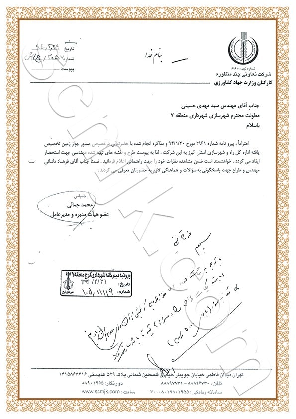 لذا با انعقاد قراردای با شرکتی معتبر و فنی که مورد تأیید شهرداری کرج می باشد طرح پیشنهادی در کارگروههای مختلف، کمیته های فنی و کمیسیون های ماده پنج استانداری مختلف اقدام لازم در جهت تثبیت و ارتقاء سطح کیفی زمین به عمل آمد که پس از اجرای مراحل طاقت فرسا و پیگیری مجدانه طرح مذکور با توکل بر خداوند متعال در قالب شهرکی با متراژ سیصدهزار متر مربع باعث گردید ارزش مضاعفی را برایزمین تخصیصی ایجاد نماید که این امر حاصل نمی گردید مگر با پشتیبانی و حمایت سهامدارن محترم که به حول و قوه الهی و دعای خیر اعضای محترم موفق شدیم در مورخ 1400/4/15 دستور نقشه از سوی شهرداری منطقه 7 کرج صادر گردد و همچنان پیگیر اخذ پروانه ساختمانی می باشیم.
